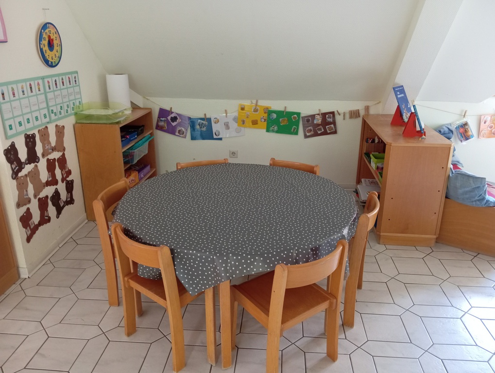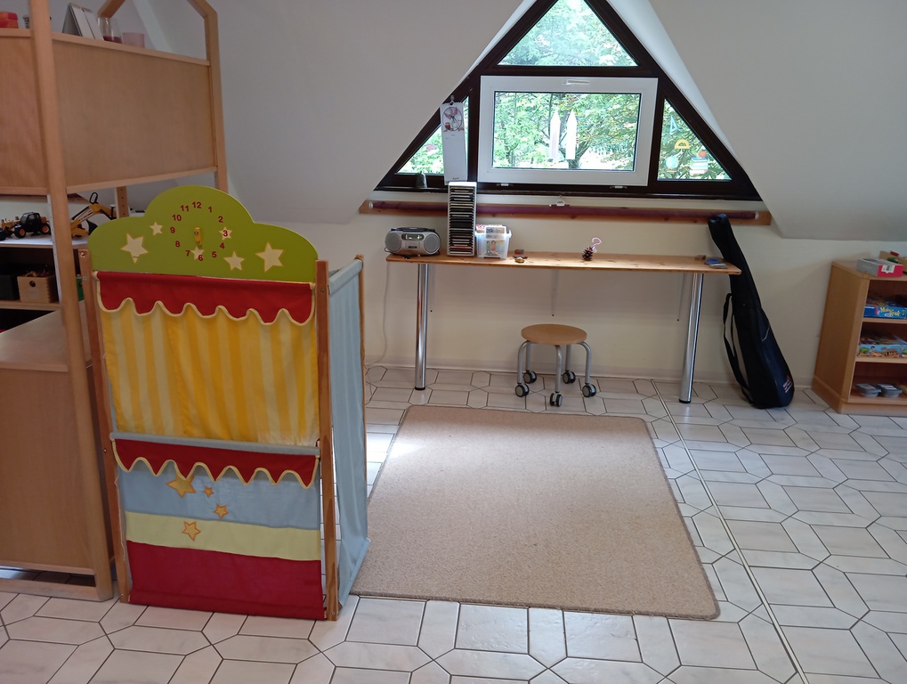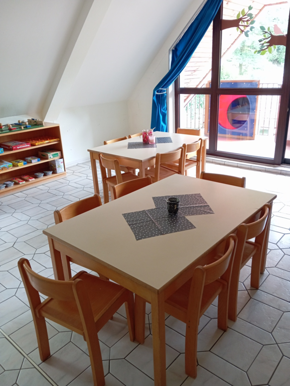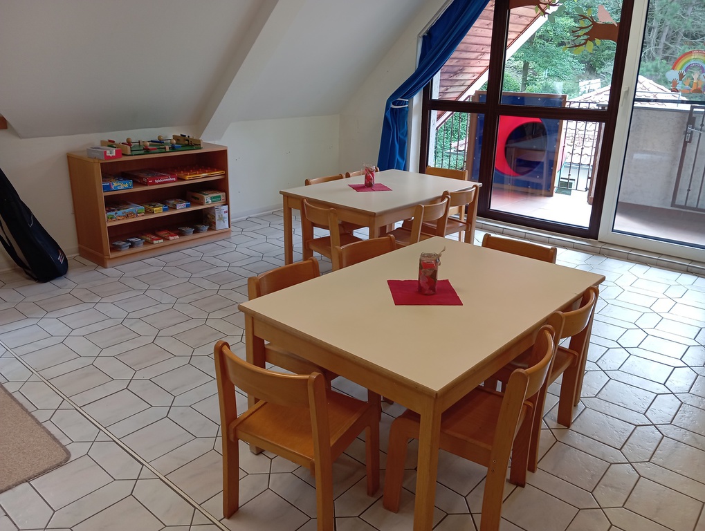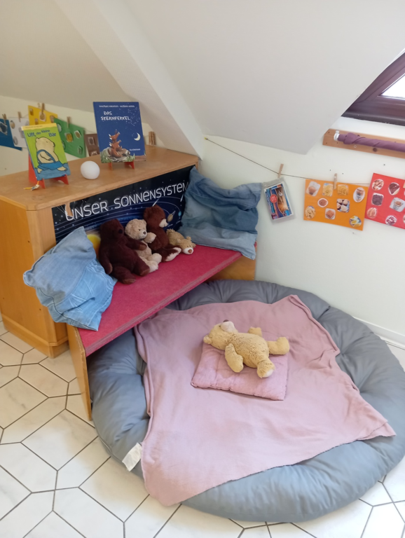 Wir gestalten unseren Kita-Alltag oft gemeinsam mit den Igeln, der Vorschulgruppe. Bei uns im Obergeschoß gibt es in den zwei Räumen verschiedene Bereiche: Bau-, Kreativ-, Spiel-, Kuschel-, Küchen- und Bastelecke, die wir selber wählen können. Mittagsruhe halten wir zusammen mit den Igeln in einem Raum. Wir werden immer selbständiger in allen Bereichen unter anderem bedienen wir uns beim Essen selber, wischen die Tische ab und schenken uns selber nach Bedarf ein. Ab und zu nutzen wir die Turnhalle mit den Großen zusammen.
