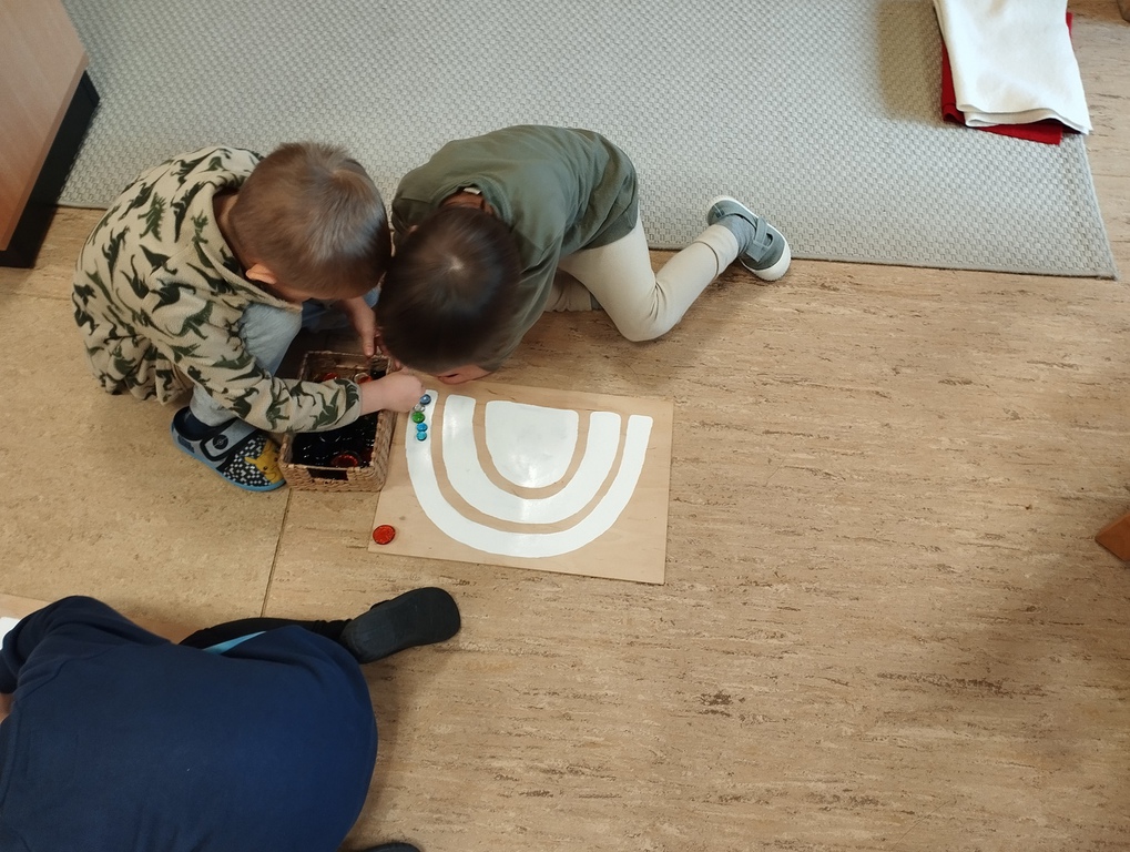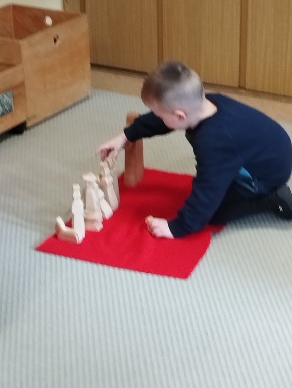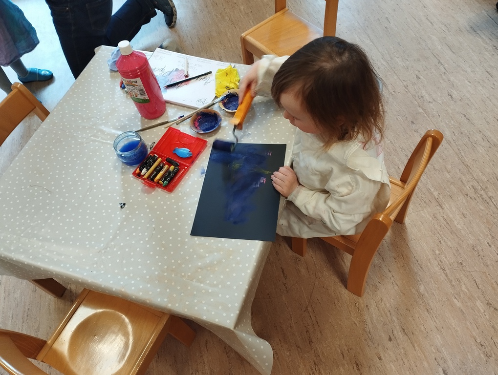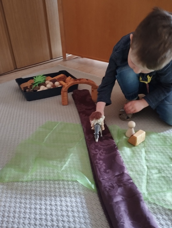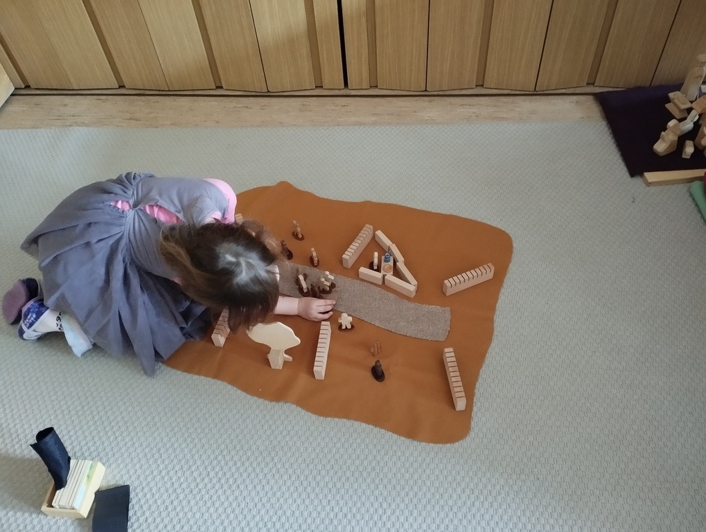 Im Baubereich laden eine Eisen-und Murmelbahn, Bausteine und Elemente aus Naturholz und andere schöne Dinge zum Spielen ein. Natürlich gibt es auch eine Puppenecke mit Küche. Die Mahlzeiten nehmen wir am hellen Fensterbereich ein. In der Kuschel-und Leseecke können wir den Tag ruhig beginnen oder uns zurückziehen.