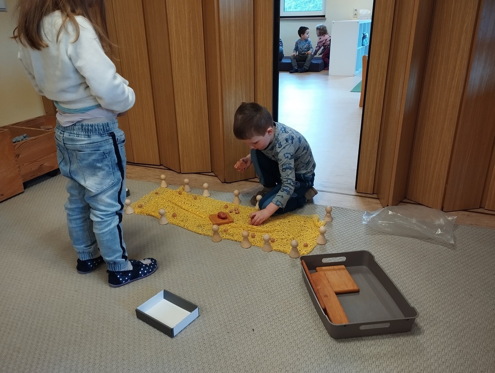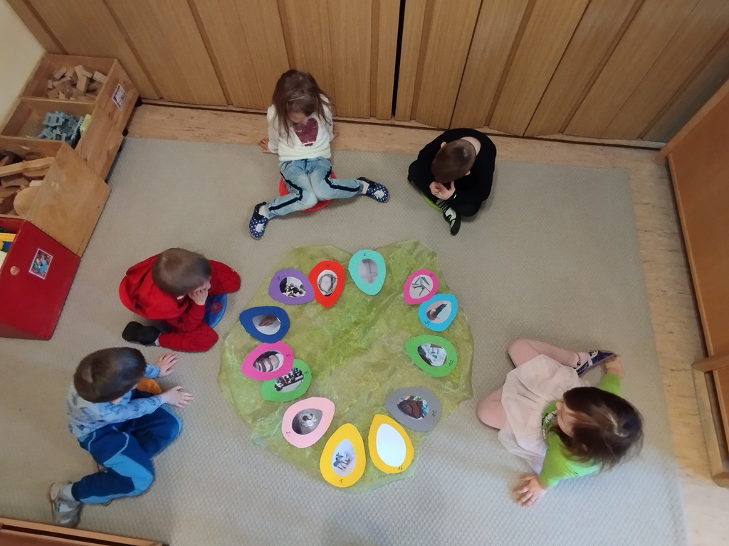 Hallo wir sind die Eichhörnchen, drei Mädchen und fünf Jungen im Alter von drei Jahren. Gemeinsam mit unserer Erzieherin Sabine entdecken wir unseren neuen, größeren Gruppenraum.