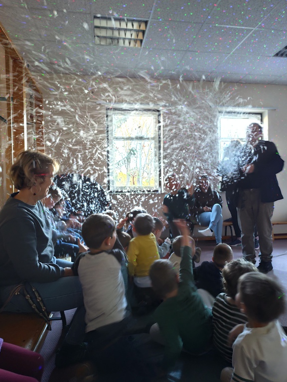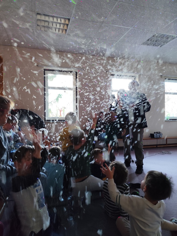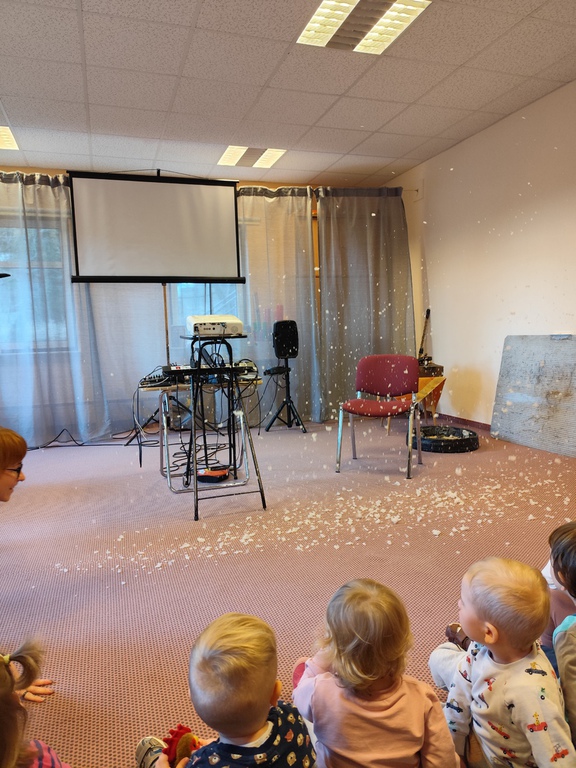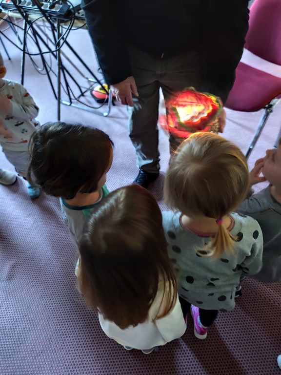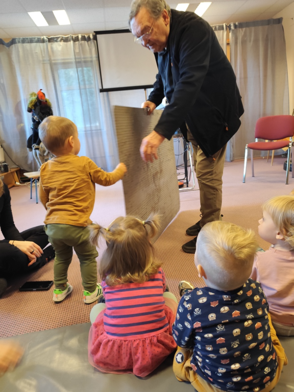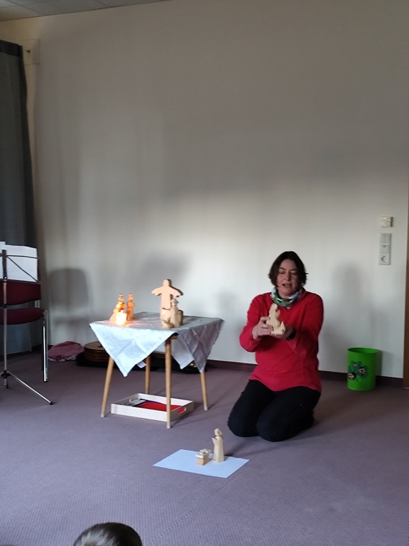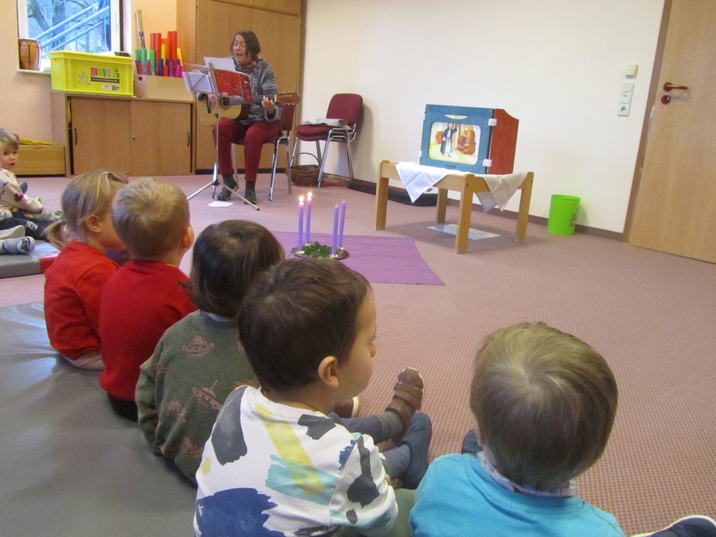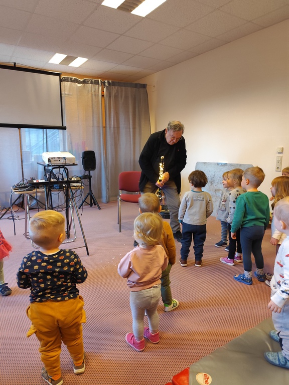 Wilfried Meister kam auch in diesem Jahr aus Weimar zu uns, um die Geschichte von den Bremer Stadtmusikanten für die kleineren Kinder , Hänsel und Gretel für die größeren Kinder zu erzählen. Er begeisterte sogar die Kleinsten mit tollen Effekten,Requisiten und Geräuschen. Natürlich konnten die Kinder auch mitmachen, sich bewegen , tanzen und selber Geräusche machen. Für alle Kinder schneite es zum Schluß im Raum.
