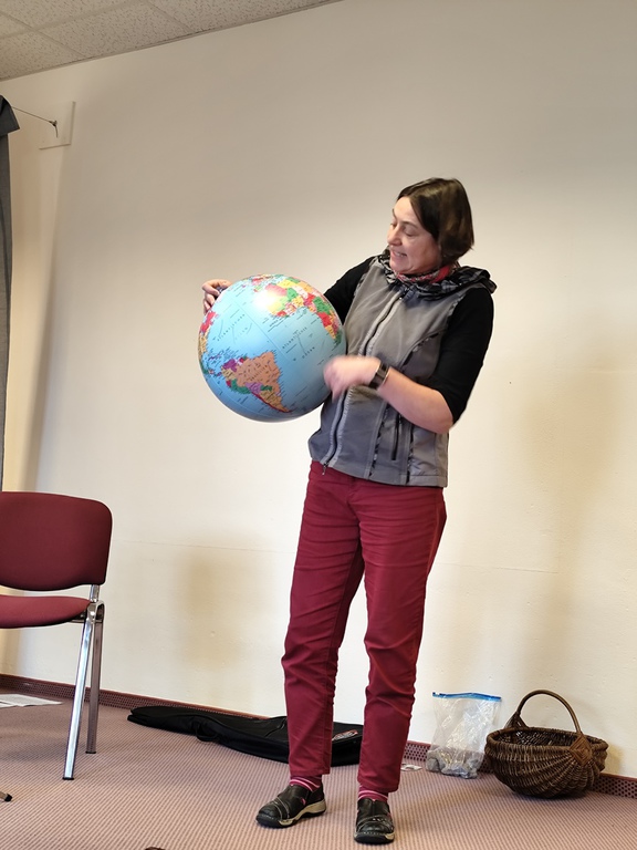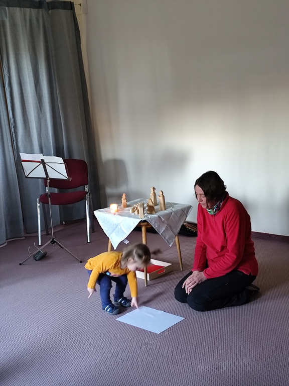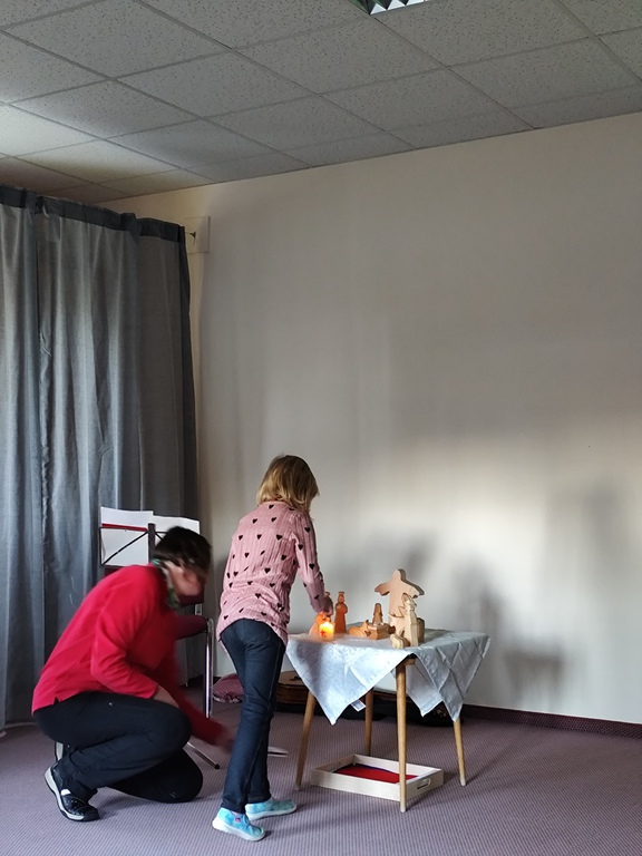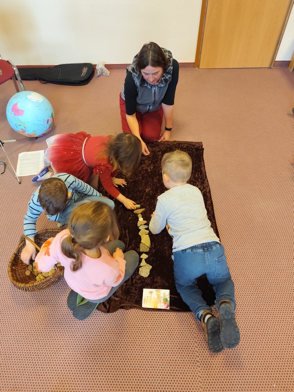 Zum diesjährigen Erntedankfest gestalteten die kleinen Fledermäuse und Eichhörnchen das Programm mit viel Freude und Engagement. Die älteren Kinder aus dem Obergeschoss bereiteten alles im Vorfeld sorgfältig vor: Drei Tage vor dem Fest brachten sie die gesammelten Erntegaben zur Kirche.