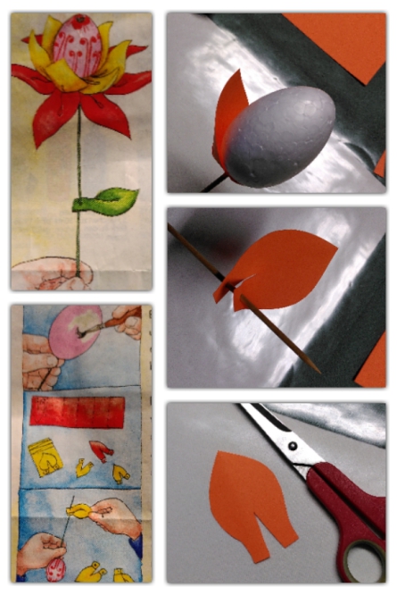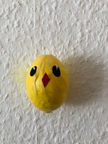 Hühnereier ausblasen, auswaschen, trocknen, bunt bemalen, aufhängen!