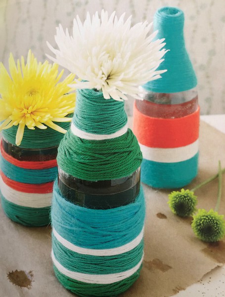 2. Beginnt mit den ersten Streifen unten an der Flasche und wickelt Wolle über das Klebeband. Drückt immer wieder den Faden fest am Klebeband. Ihr könnt den Faden ganz parallel wickeln oder auch wild durcheinander..